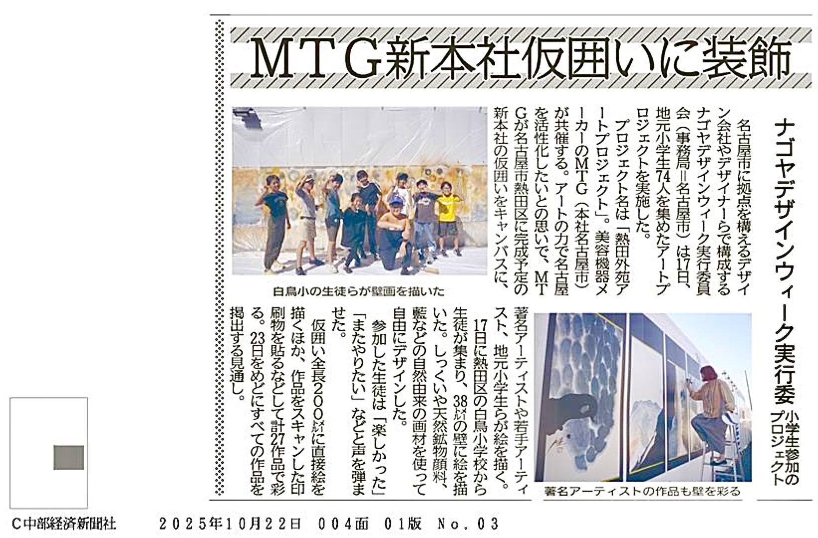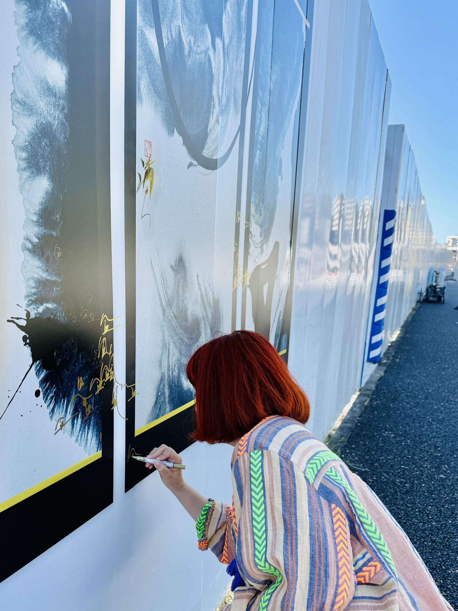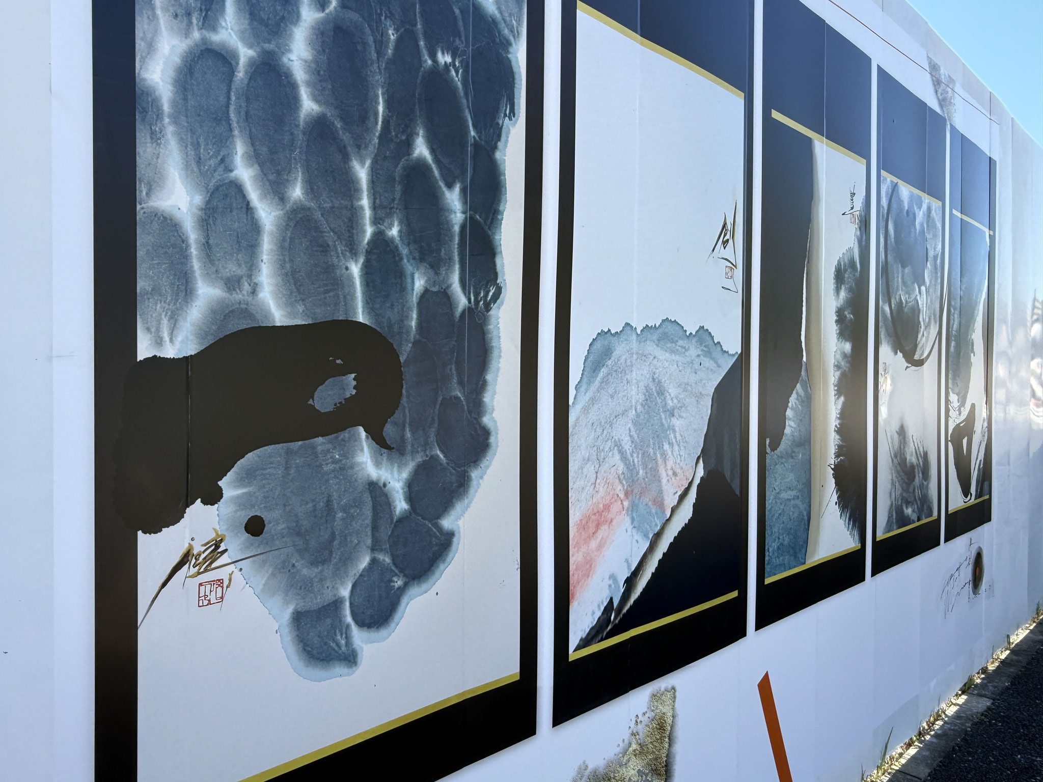 ナゴヤデザインウイーク2025の一環としての企画である「熱田外苑・仮囲いアート~MTG本社の仮囲いを使った町の風景を彩るアートプロジェクト~」の、シンボルアーティストとして、[共感のウェルビーイング]を表現しました。鈴鹿墨や美濃和紙などの東海地方の宝を使った墨象作品を仮囲いシートへの印刷で、また、その上から金色で「風」を直書きすることで、すべての作品をつなげてゆくような作品を心掛けました。