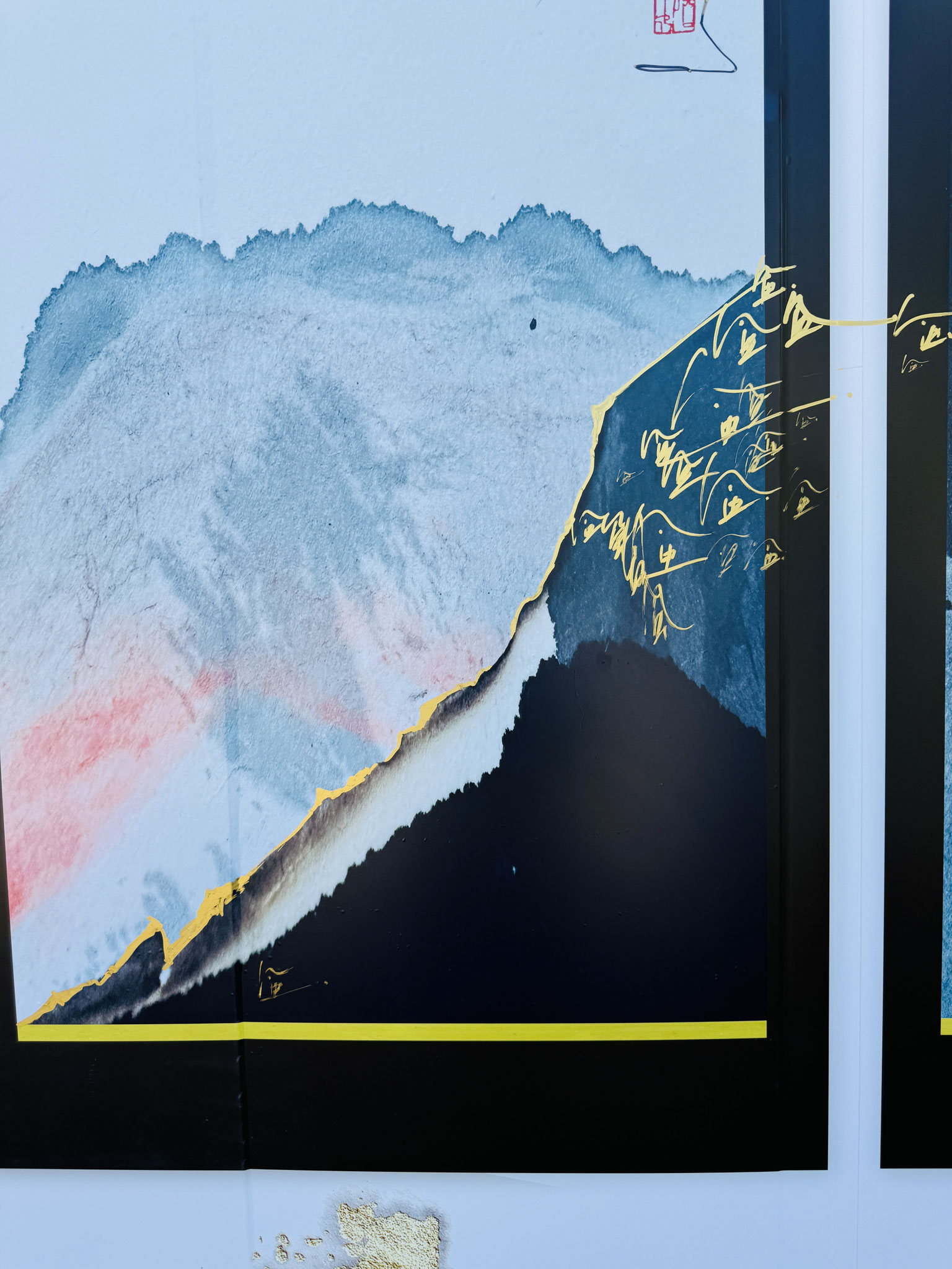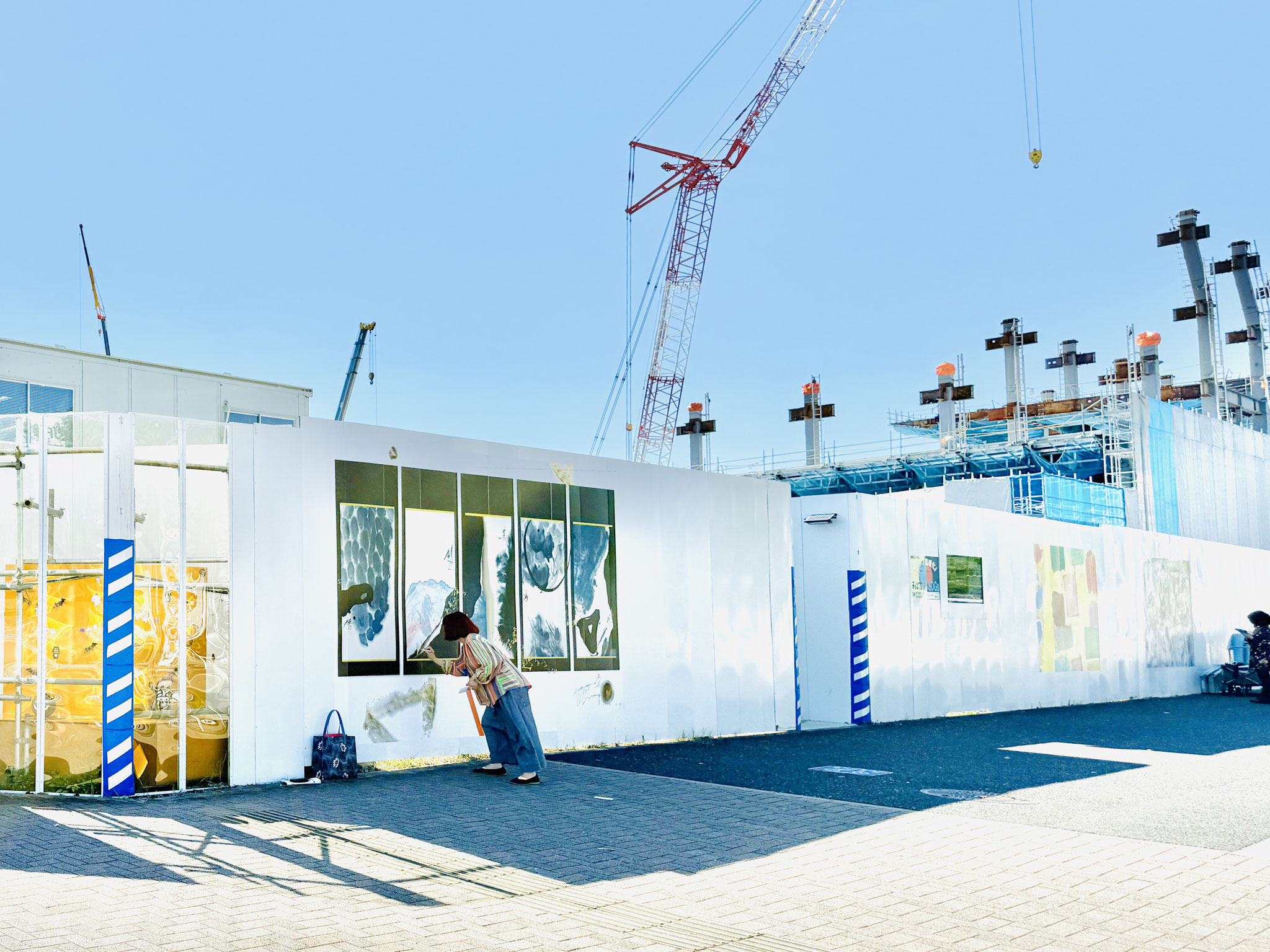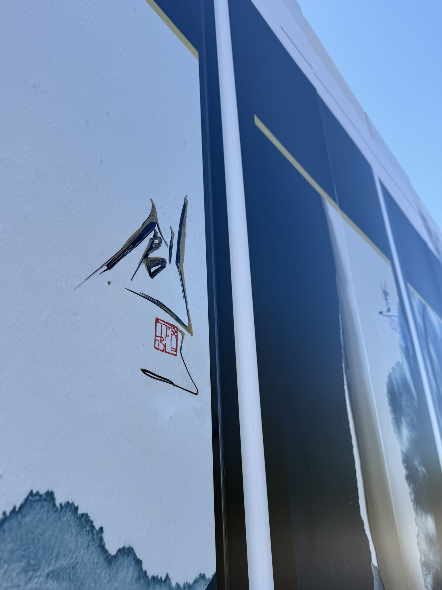 ナゴヤデザインウイーク2025の一環としての企画である「熱田外苑・仮囲いアート~MTG本社の仮囲いを使った町の風景を彩るアートプロジェクト~」の、シンボルアーティストとして、[共感のウェルビーイング]を表現しました。鈴鹿墨や美濃和紙などの東海地方の宝を使った墨象作品を仮囲いシートへの印刷で、また、その上から金色で「風」を直書きすることで、すべての作品をつなげてゆくような作品を心掛けました。