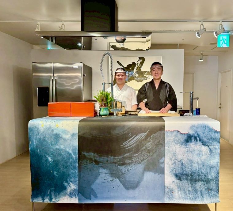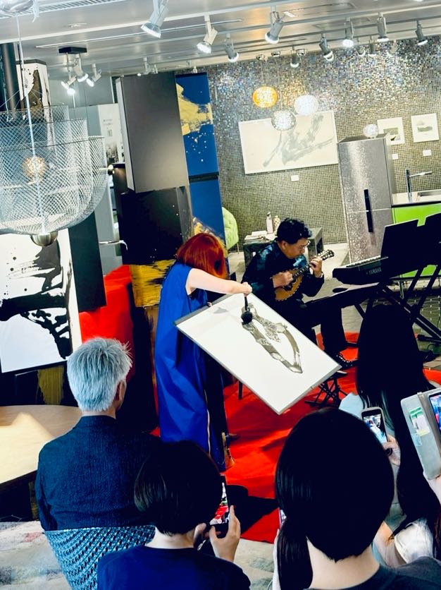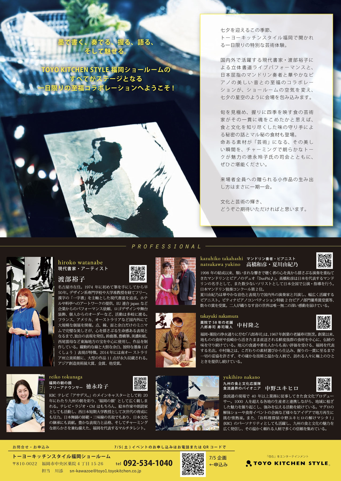 トーヨーキッチンスタイル福岡での個展の初日7月5日(土)には、五感を刺激する特別なオープニングイベントを開催いたします。日本で三本の指に入るマンドリン奏者・高橋和彦氏とピアニスト夏川由紀乃氏とのコラボレーションパフォーマンス、福岡の老舗「八郎寿司」大将・中村隆之氏による「口福の一皿」、食文化プロデューサー中野幸浩氏によるスペシャルトークと本日しか口にできないサプライズフード、司会はなんと、TV番組「アサデス。」で20年も司会されたみなさまお馴染みの徳永玲子氏。