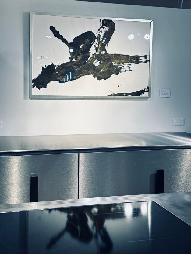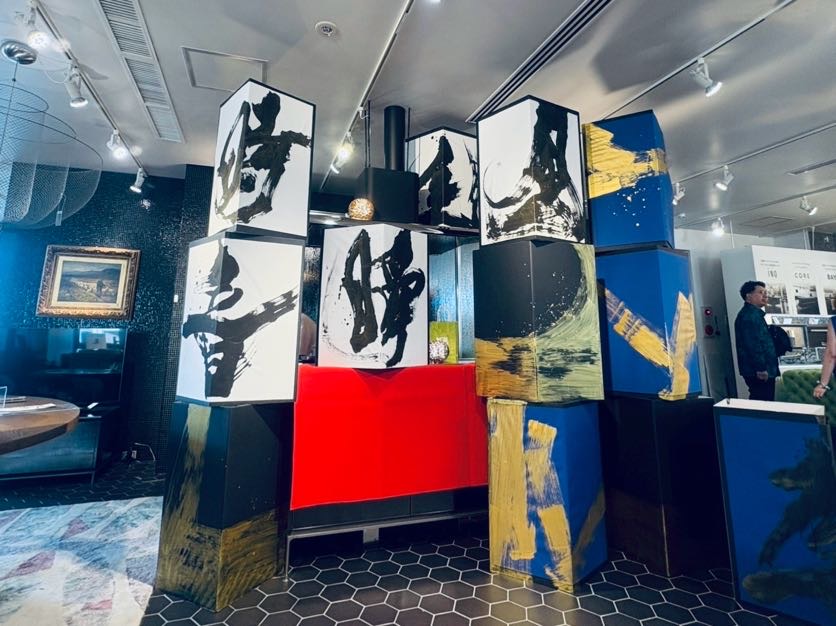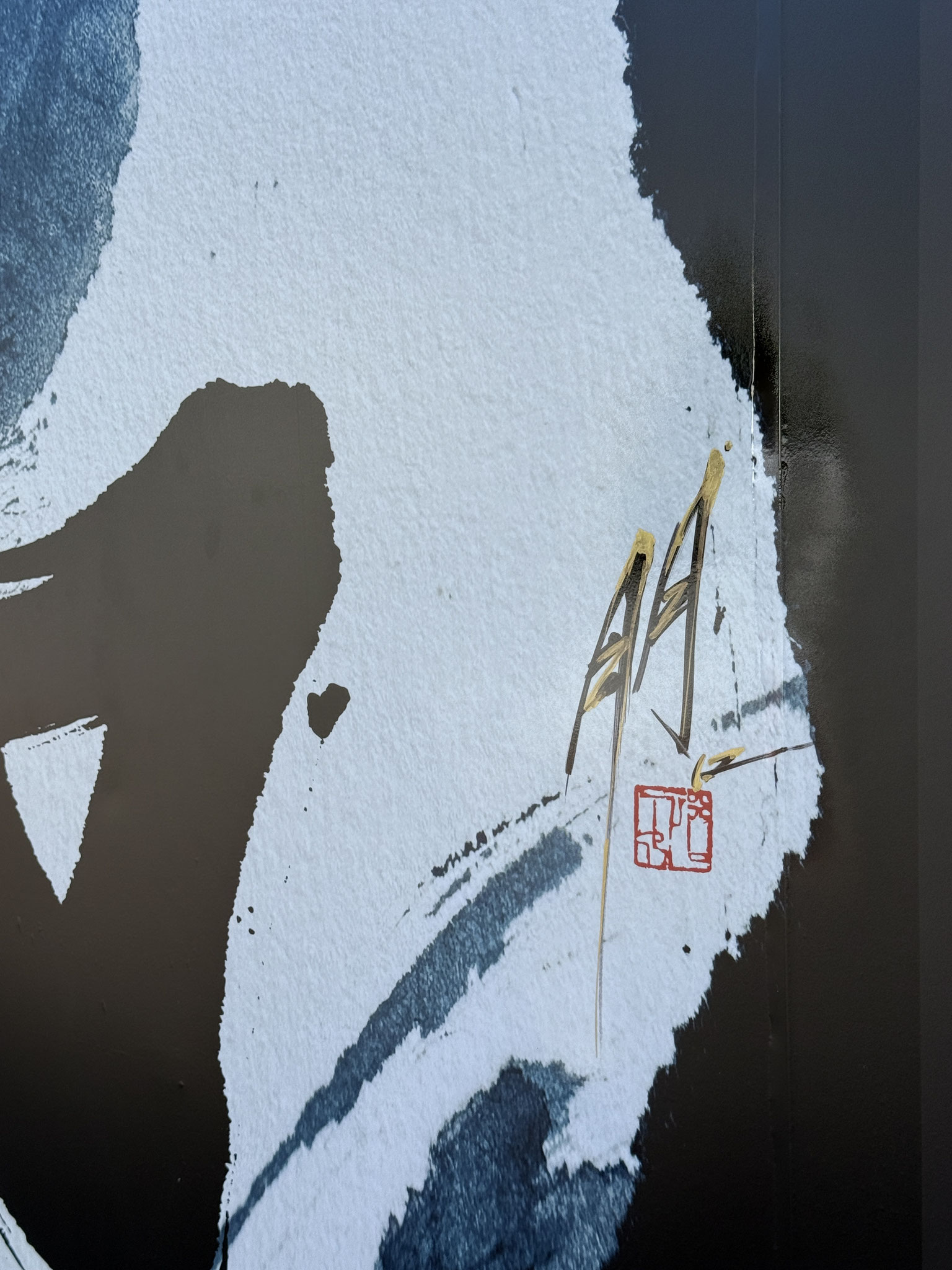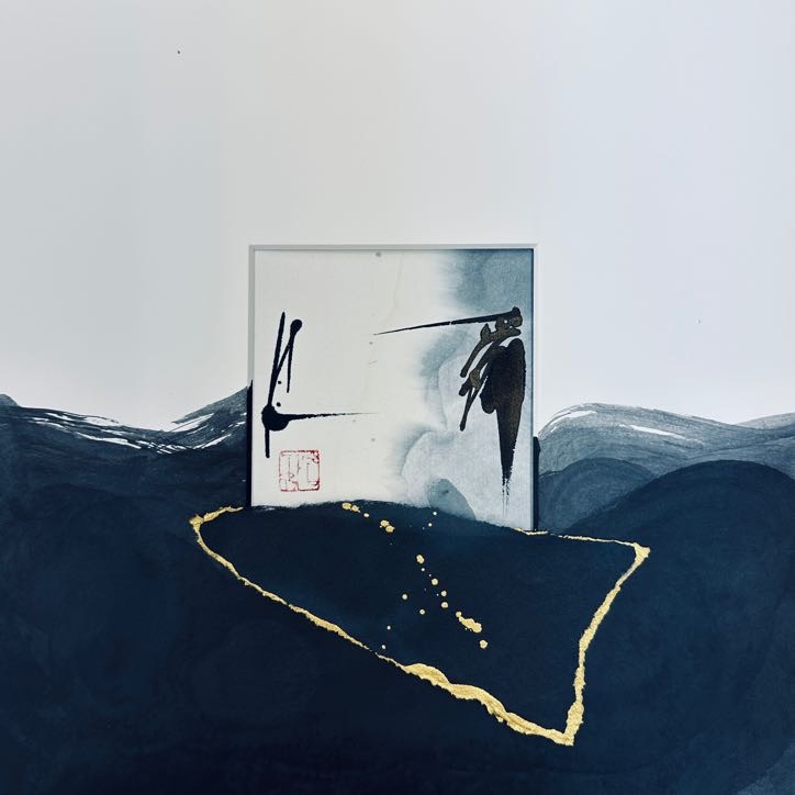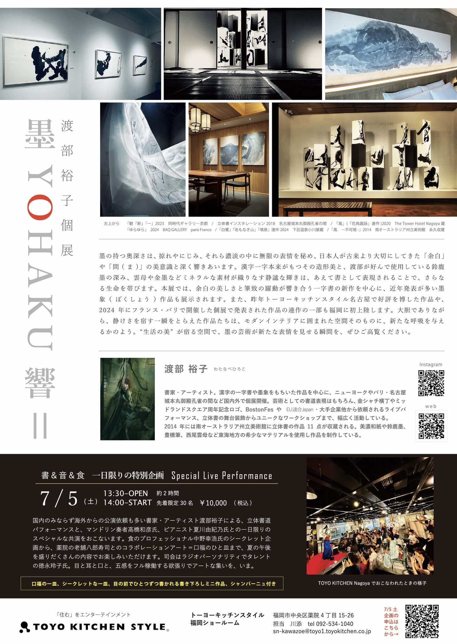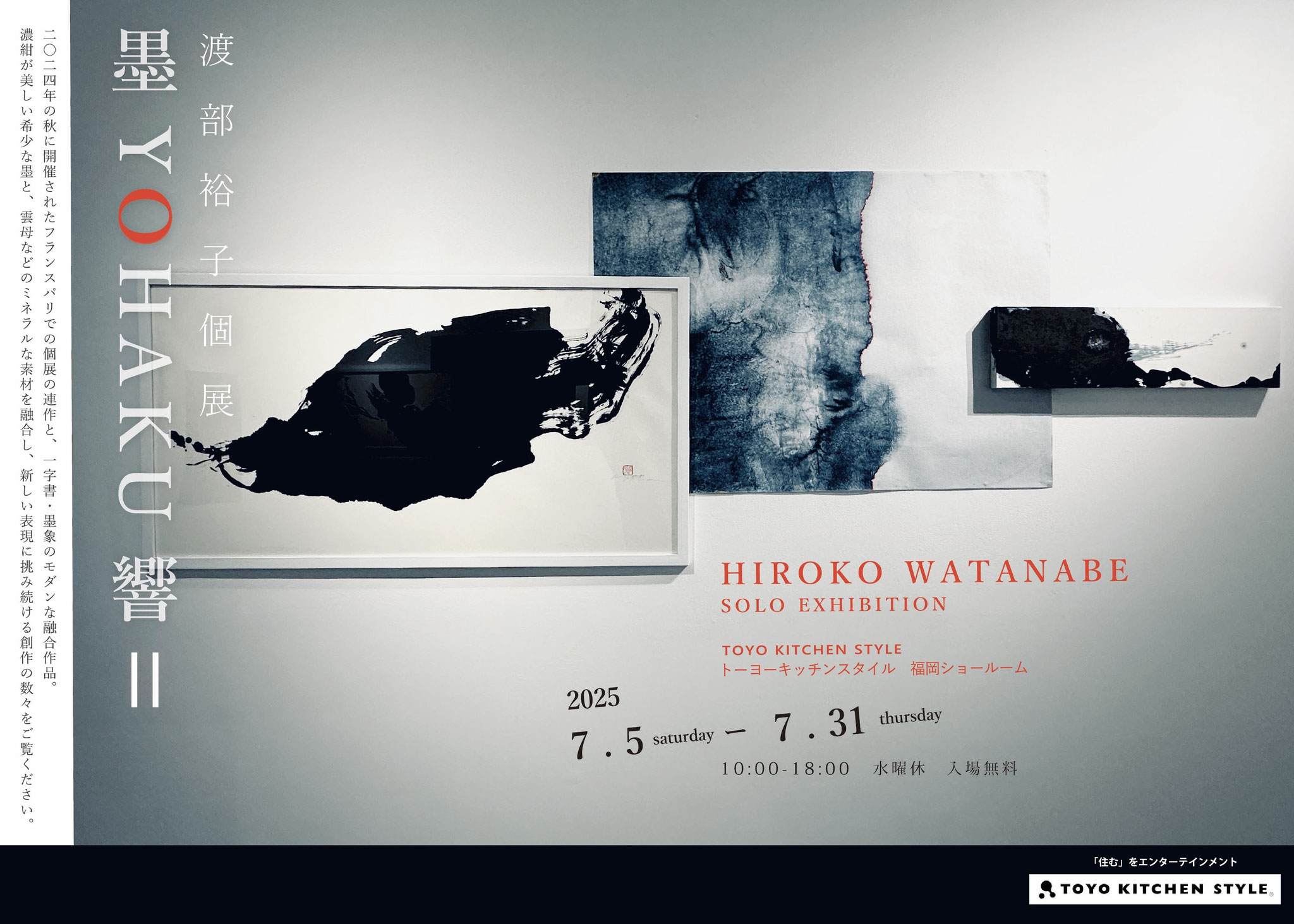 2024年に好評いただいたトーヨーキッチンスタイル名古屋での個展に引き続き、この度、トーヨーキッチンスタイル福岡ショールームにて個展をさせていただくこととなりました。2024年の秋に開催されたフランスパリでの個展の連作と、一字書・墨象のモダンな融合作品。濃紺が美しい希少な墨と、雲母などのミネラルな素材を融合し、新しい表現に挑み続ける創作の数々。モダンインテリアと、前衛書道のコントラスト、みなさまお楽しみいただけることと思います。初日はオープニング企画(7/5土曜)も開催しますので、ぜひ足をお運びくださいませ。