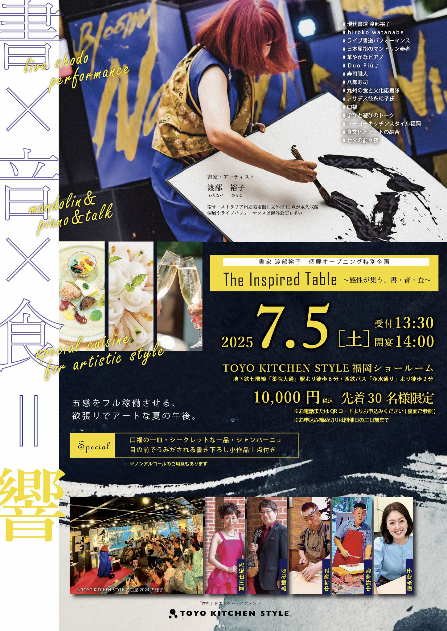 一夜限りの音と書と食のインスタレーションが、空間をアートに変えていきます。福岡でも、日本文化の“いま”を伝える場を多くの方にお届けできましたら幸いです。