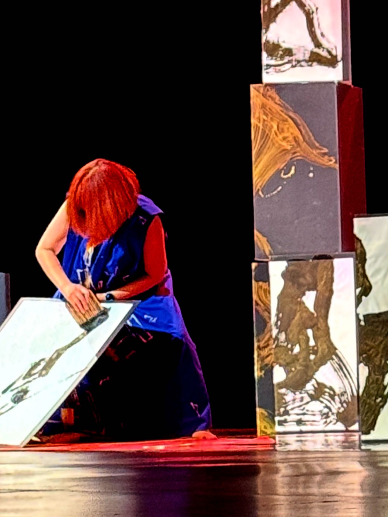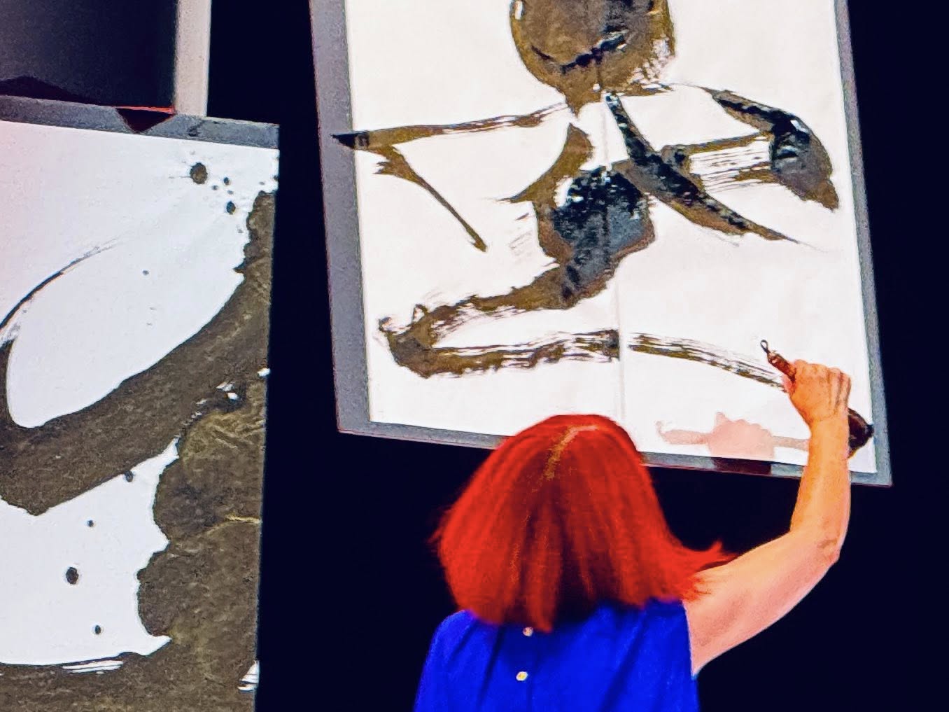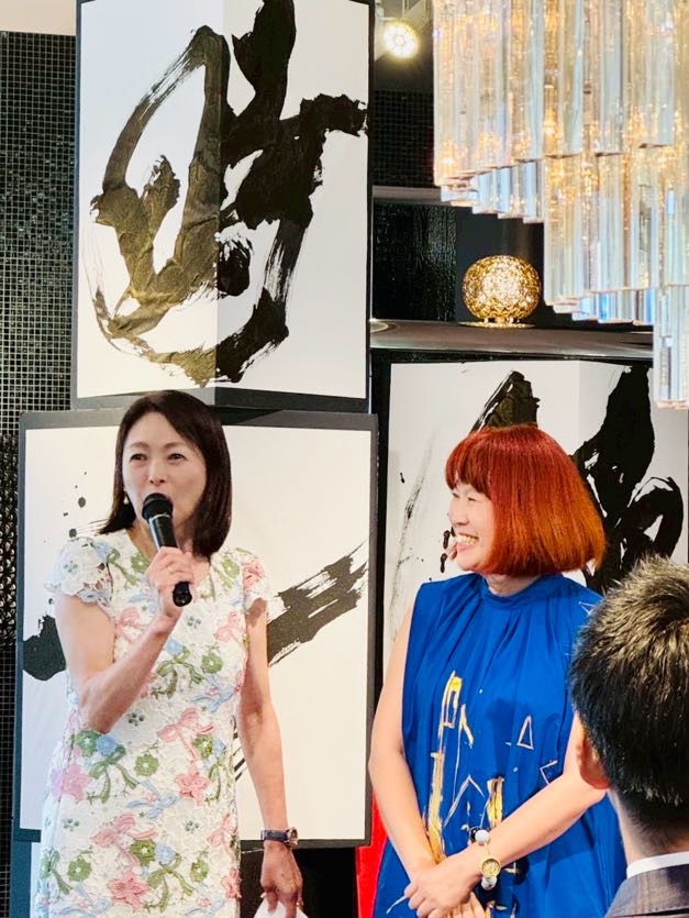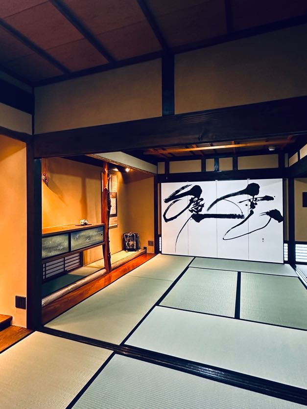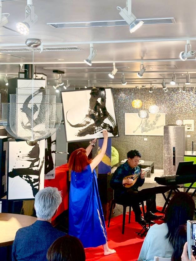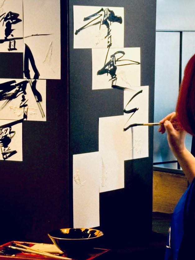 今年でもう13年も展示&パフォーマンスさせていただいている、ご縁深い小布施。今年は、展示はもちろん、なんと5mもの高さの場所(玄照寺の奥にある杉)に吊るされて、アクロバット的パフォーマンスもしてきました!コラボレーションしたのは、ギタリスト長谷川将司氏と、「空師のあそび「という名で活動している、佛円重文氏が率いる木のスペシャリストたち。どんどん上にあがっていき、ハーネス一つで筆で大きな文字を書く体験は唯一無二。世界広しと言えども、木に吊るされてライブ書パフォーマンスしたのは私が世界初でしょう。来年もおこなうことが決定しています!