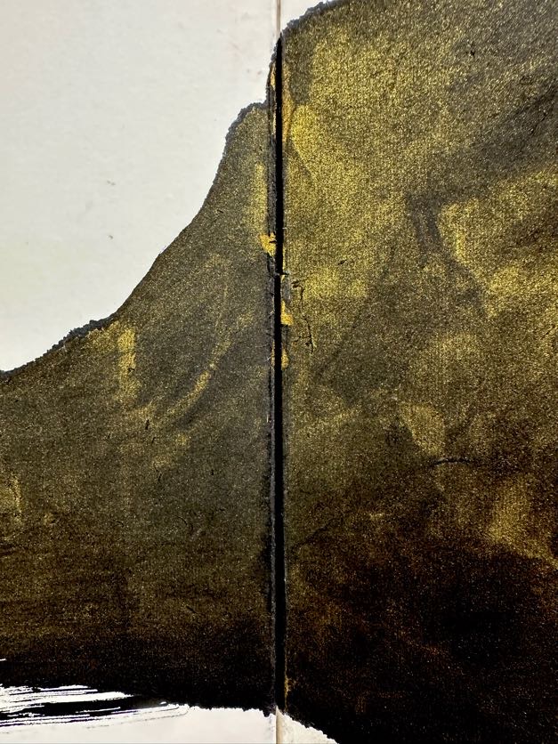 テーマである“Liminal” は”「境界」や「遷移的な」という意味で、「閾」と同じく、ある場所から別の場所への移行の空間を指します。墨が滲んでゆく先には、線と線との間にうまれたLiminalな間があり、それは、何かが「終わった」わけでも「始まった」わけでもない、静かで不安定で、けれど強いエネルギーをはらんだ「あわい(間)」。我々の愚かな過ちを見透かしているかのような、目には何も映らない、白。