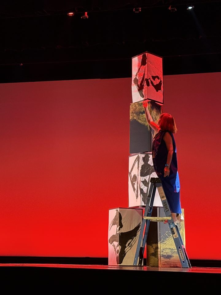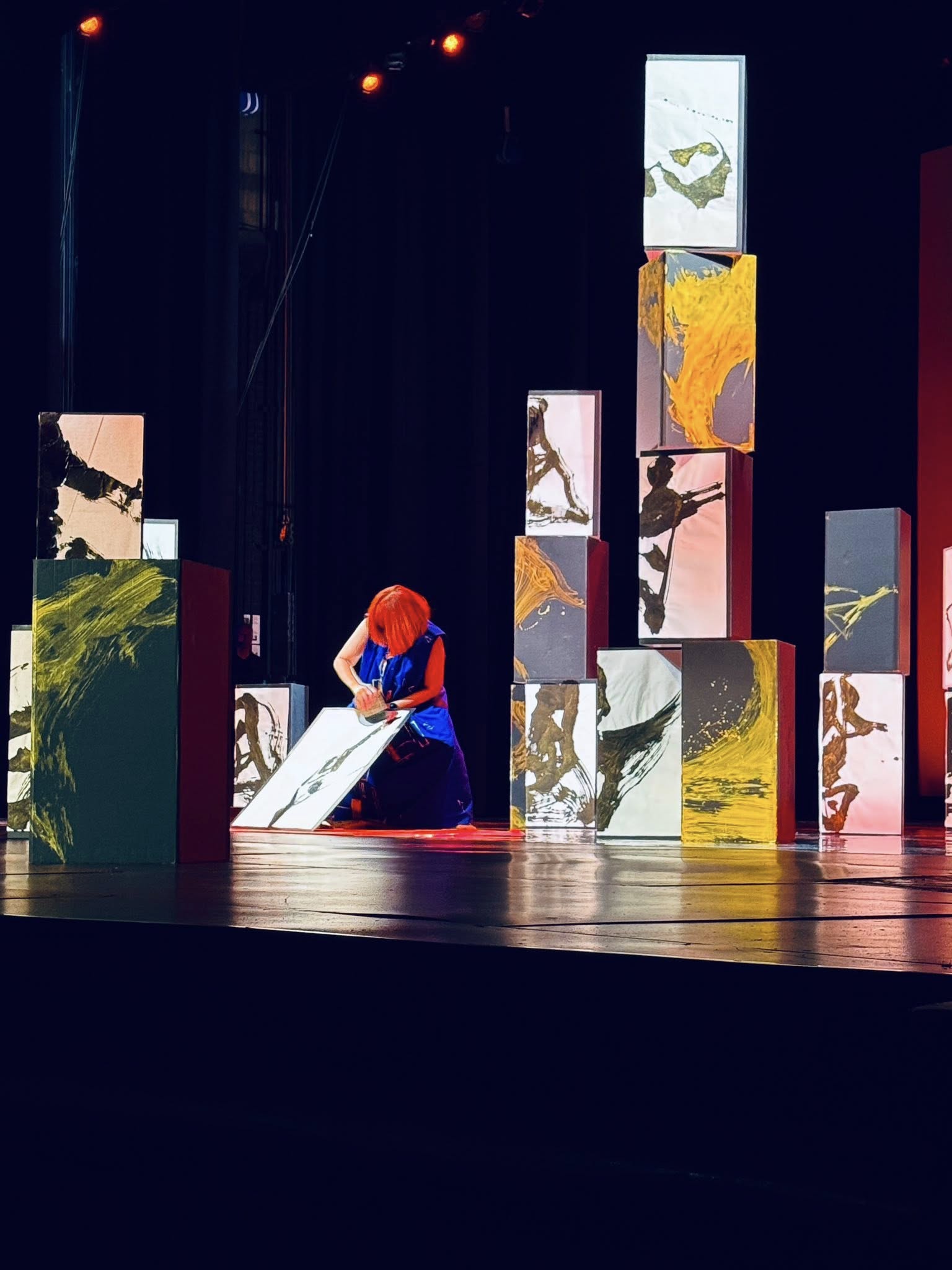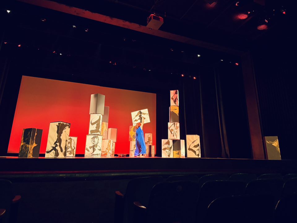 大人気の和太鼓&マリンバのユニット、GONNA。木村勇介率いるこのグループがさまざまなプロミュージシャンとコラボレーションする祭典「THE」のスペシャルライブの舞台装飾をさせていただきました。いつもよりサイズが大きな立体書に、「THE」「和太鼓」「GUITAR」「雫」「幻」などの文字を書き、上から吊るし、さまざまな照明に照らされ、七変化していく様は、圧巻でした!