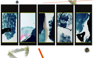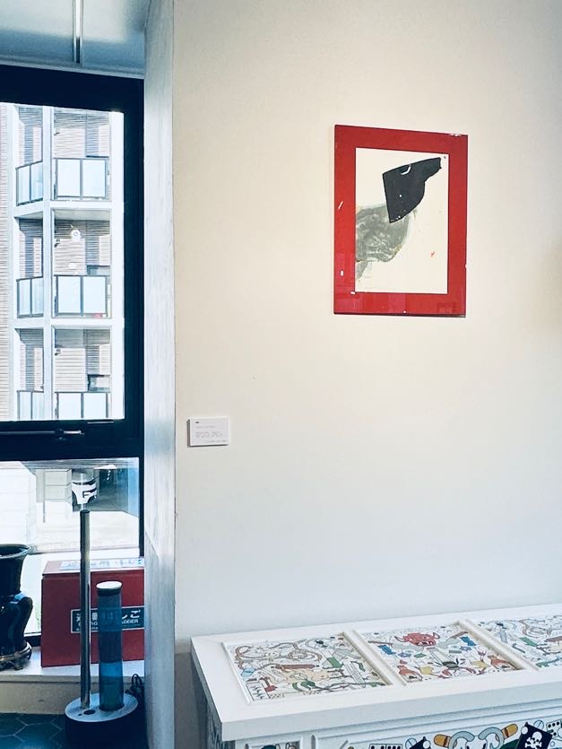 凛とした赤いフレームの「鷹」作品は、100年前のフランスのファッション誌の上に墨で書いたもの。オールドエスプリの香りを感じていただけたら幸いです。
